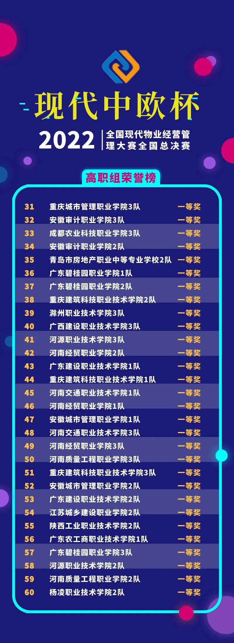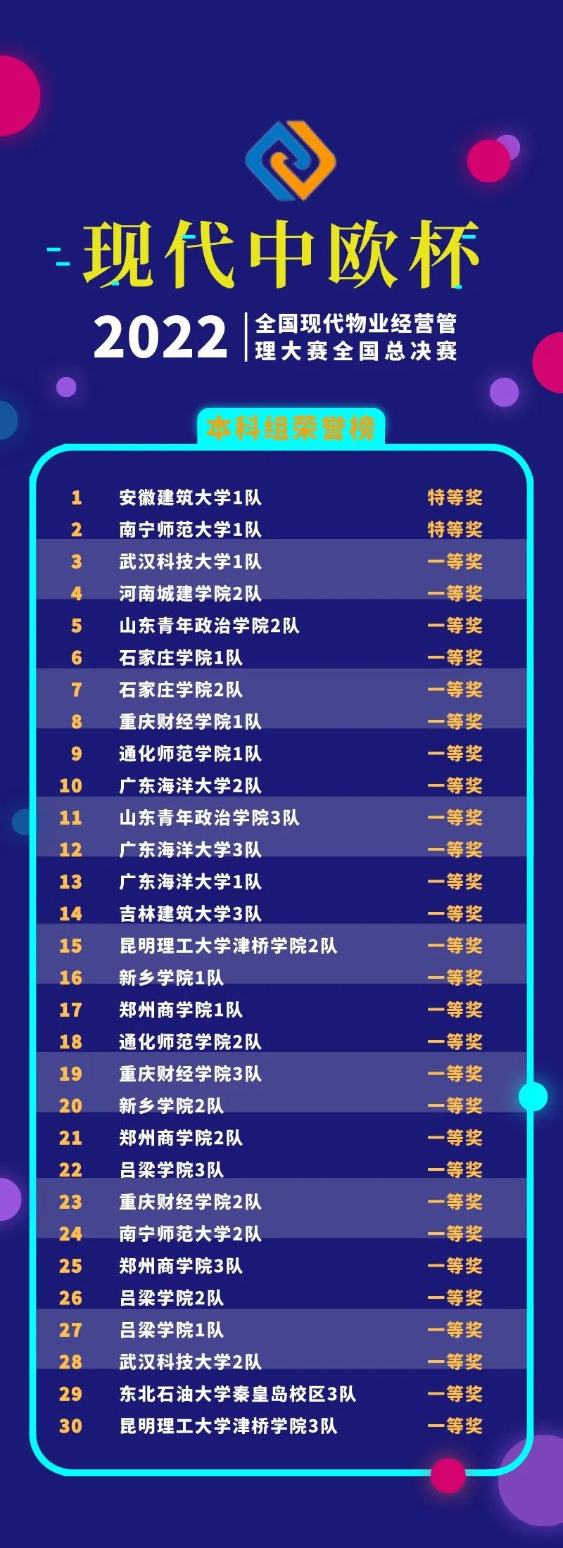 經(jīng)過線上競賽的激烈比拼,2022年“現(xiàn)代中歐杯”全國現(xiàn)代物業(yè)經(jīng)營管理大賽全國總決賽獲獎名單揭曉。
