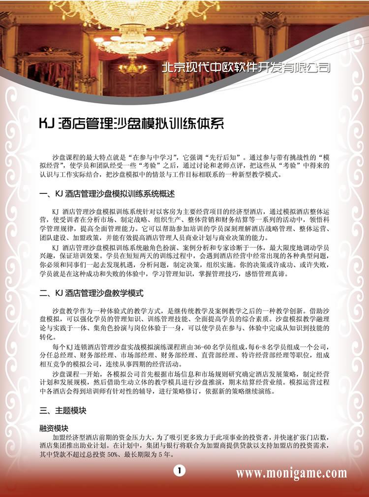 它可以幫助參加培訓(xùn)的學(xué)員深刻理解酒店戰(zhàn)略管理、整體運(yùn)營、團(tuán)隊(duì)建設(shè)、加盟政策,并能有效提高酒店管理人員商業(yè)計(jì)劃與商業(yè)決策的能力。
