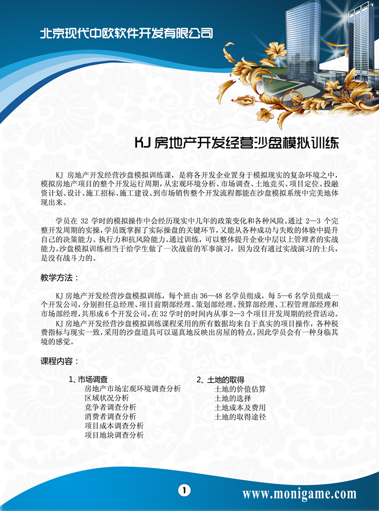 學員在2—3天的模擬操作中會經(jīng)歷現(xiàn)實中幾年的政策變化和各種風險。通過2—3個完整開發(fā)周期的實操,學員既掌握了實際操盤的關(guān)鍵環(huán)節(jié),又能從各種成功與失敗的體驗中提升自己的決策能力、執(zhí)行力和抗風險能力。