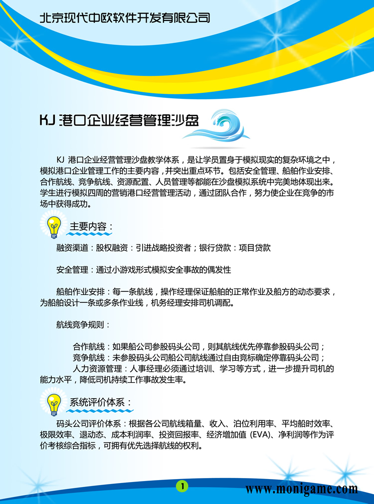 1、港口企業(yè)經(jīng)營(yíng)管理沙盤以財(cái)務(wù)知識(shí)普及和港口決策能力訓(xùn)練為重點(diǎn),全面提升學(xué)員港口管理決策能力和執(zhí)行能力;